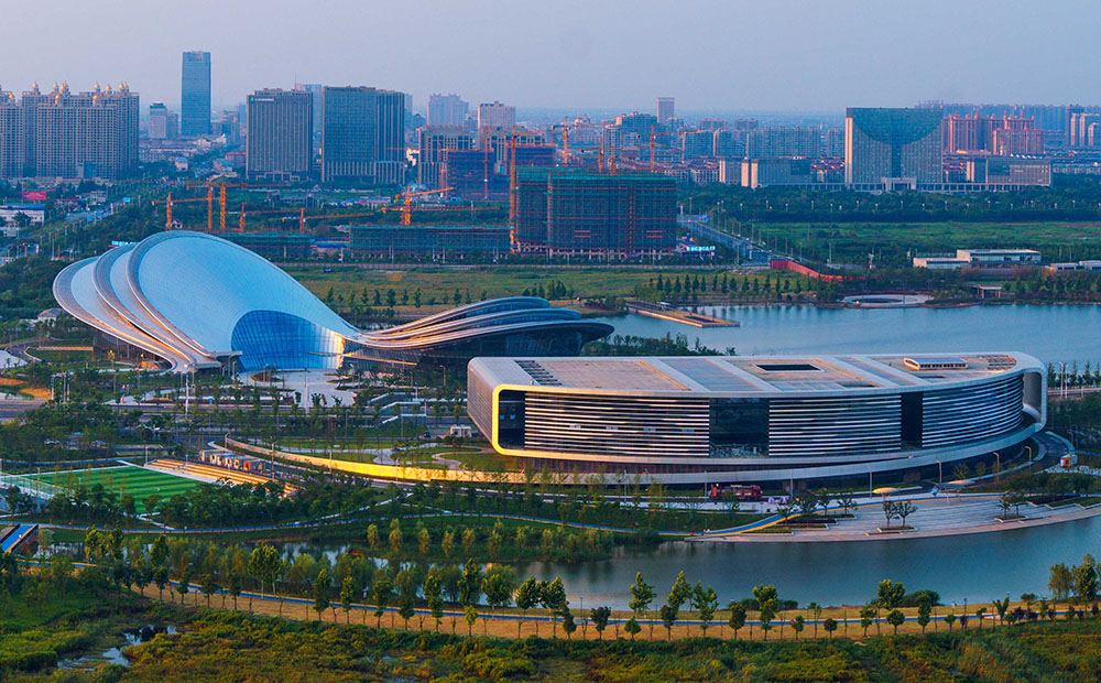 启东市文化体育中心,建筑面积79571平方米。地下一层为车库及设备用房,北区地上一至三层为大剧院、文化馆;南区地上一到四层,含全民健身中心、规划馆、图书馆。室内有石材、地砖、木地板、PVC地胶等楼地面;石材、面砖、铝板、GRG等艺术墙面;铝板、格栅GRG、石膏板等艺术吊顶。北区由斜圆柱构成的不规则空间混凝土结构,屋面为“蝶”形双层铝板屋面,双曲面玻璃幕墙。南区框架结构,穿孔造型铝板装饰幕墙。交付后为启东市提供了较好的社会效益。