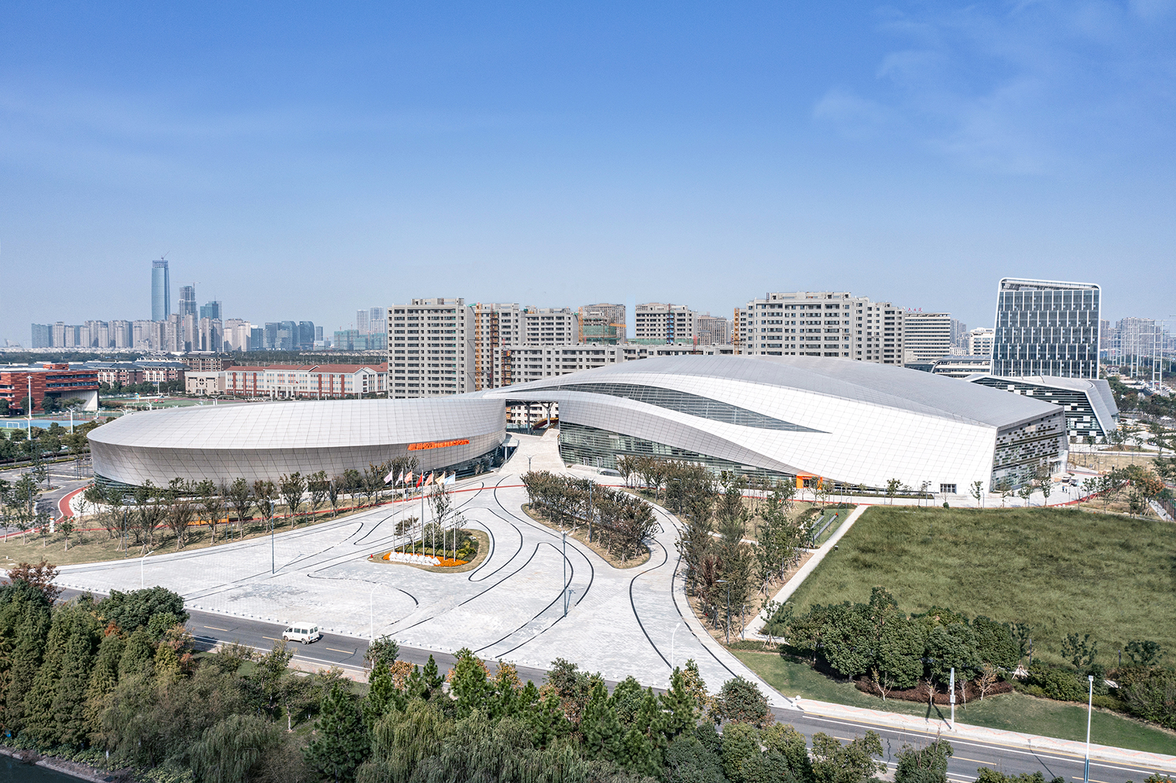 苏州湾体育中心-体育馆、游泳馆位于苏州市吴江区太湖新城芦荡路与松陵大道交叉口,由体育馆、游泳馆两个部分组成。体育馆建筑面积29017.53㎡,游泳馆建筑面积11842.82㎡,总建筑面积40860.35㎡。以体育功能为核心业态,通过竞赛、训练、健身、休闲等体育活动叠加商业、酒店、餐饮等多样化业态,形成体育+商业的业态布局理念,发挥多种业态的叠加效应,是集市民健身、休闲、购物以及承办大型体育专项赛事等多功能于一体的城市综合体。