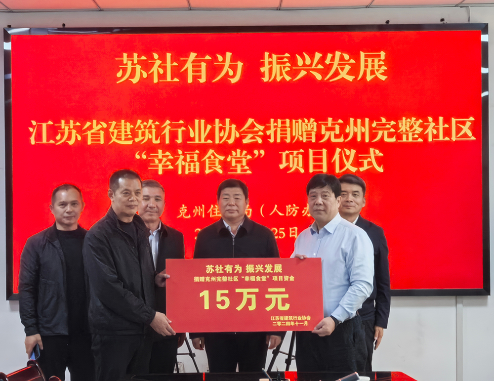 蒋同进对江苏省委省政府和江苏省建筑行业协会一直以来对新疆的援助表示感谢。他强调,此次捐赠既体现了江苏省建筑行业协会的有为担当,也体现了对克州的深情厚谊。建设完整社区重点在于完善社区服务设施、打造宜居生活环境、推进智能化服务、健全社区治理机制四个方面,最需要聚焦的是为民、便民、安民。希望各参与单位在项目实施阶段要统筹谋划、因地制宜,打造符合当地群众饮食习惯、接地气的食堂,并要持续关注保证食堂的长期健康运行,将好事办好,切实提升人民群众的幸福感和获得感。下一步,江苏援克前指将秉持“克州所需、江苏所能”的模式,持续聚焦群众关切的“一老一幼”设施建设,因地制宜探索完整社区建设方法、创新建设模式、完善建设标准,在克州打造一批安全健康、设施完善、管理有序的完整社区样板,增进民生福祉,切实提高人民生活品质,为克州高质量发展贡献更多江苏力量。