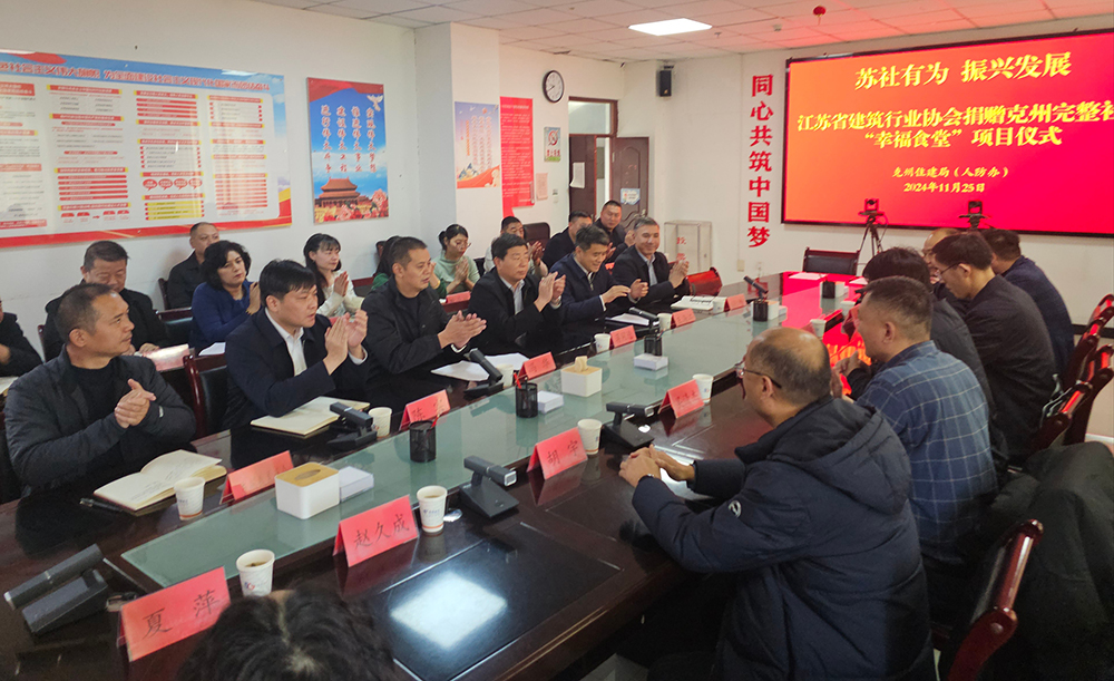 为贯彻落实民政部和江苏省委省政府关于东西部协作、对口支援工作的文件精神,切实发挥社会组织在参与乡村振兴、促进共同富裕中的积极作用,11月25日下午,根据江苏省民政厅确定的2024年社会组织协作帮扶项目工作安排,江苏省建筑行业协会赴新疆克州开展完整社区“幸福食堂”项目资金捐赠活动。江苏对口支援克州前方指挥部党委书记、总指挥、克州党委副书记蒋同进,江苏省住建厅新疆办负责人吴清杰,协会副会长兼秘书长孙忠建,克州住建局党组书记、副局长、二级巡视员王海江、副局长陈实,克州民政局党组副书记、局长冯华等领导,以及新疆、江苏两地部分建筑企业负责人等参加活动。