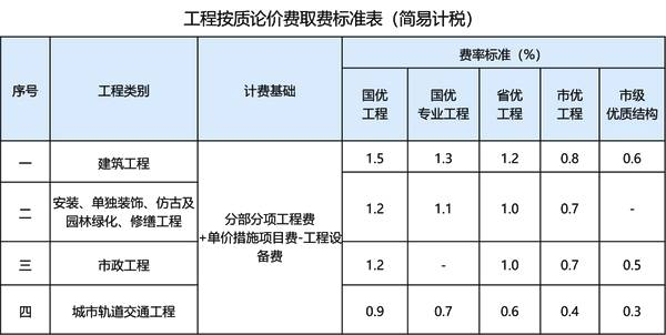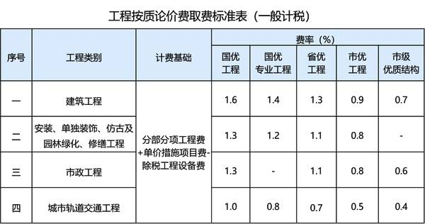 1、工程按质论价费用按国优工程、国优专业工程、省优工程、市优工程、市级优质结构工程五个等次计列。