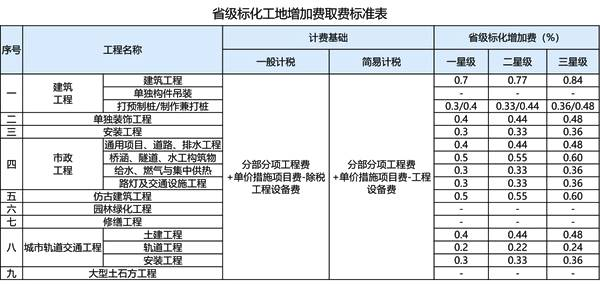 注:对于开展市级建筑安全文明施工标准化示范工地创建活动的地区,市级标化工地增加费按对应省级费率乘以0.7系数执行。市级不区分星级时,按一星级省级标化增加费费率乘以0.7系数执行。
