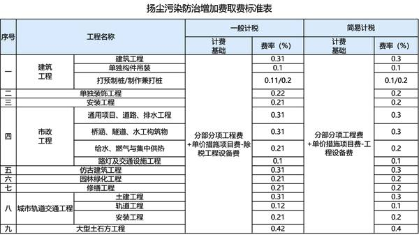 2、扬尘污染防治增加费用于采取移动式降尘喷头、喷淋降尘系统、雾炮机、围墙绿植、环境监测智能化系统等环境保护措施所发生的费用,其它扬尘污染防治措施所需费用包含在安全文明施工费的环境保护费中。
