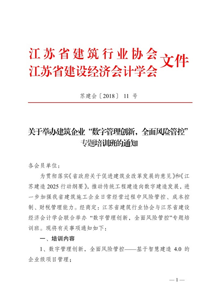 关于举办建筑企业“数字管理创新,全面风险管控”专题培训班的通知