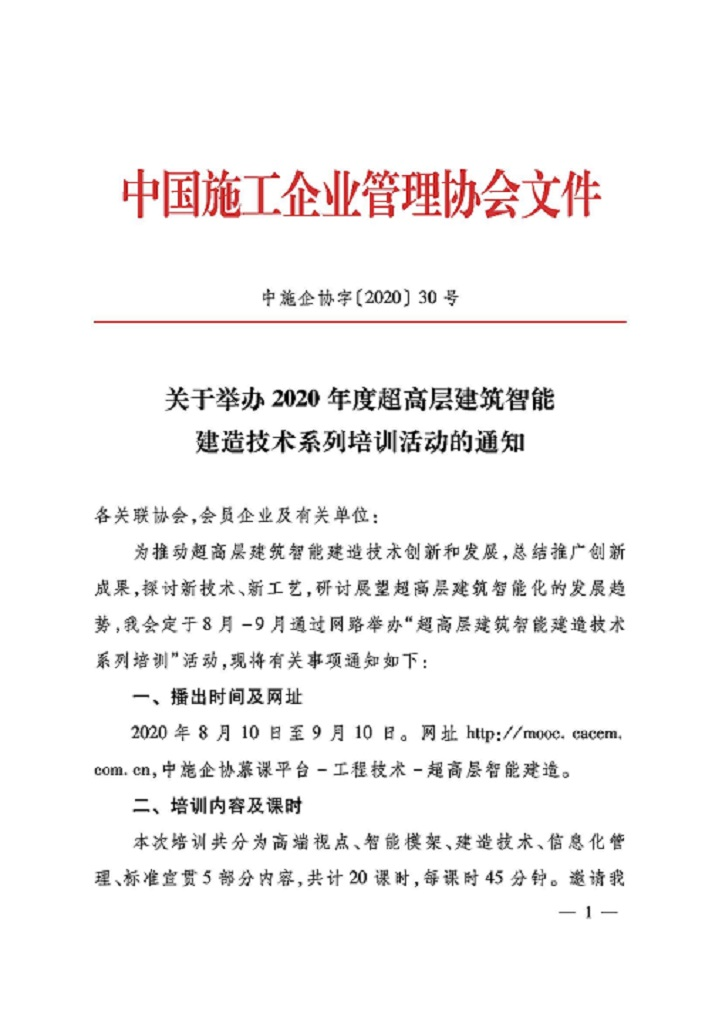 关于举办2020年度超高层建筑智能建造技术系列培训活动的通知