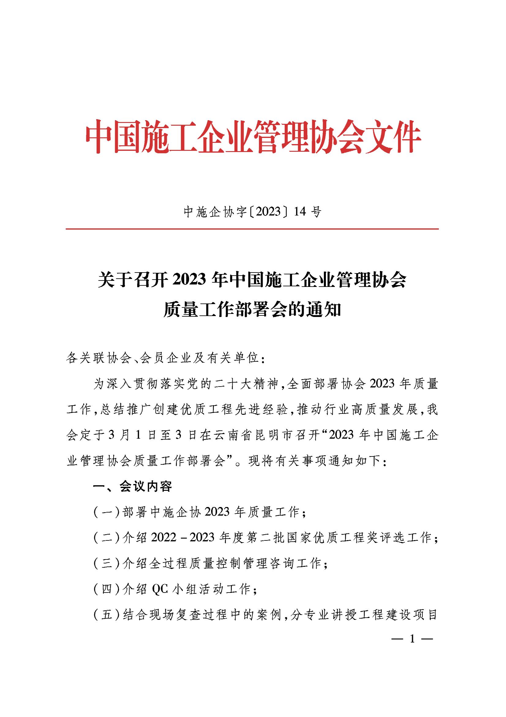 关于召开2023年中国施工企业管理协会质量工作部署会的通知