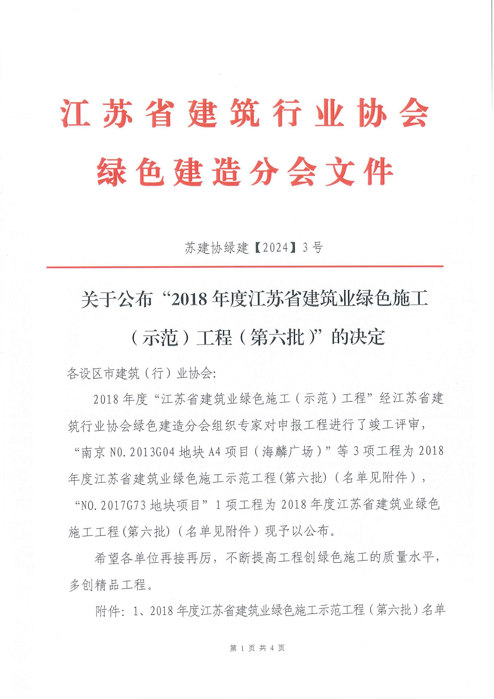 关于公布“2018年度江苏省建筑业绿色施工(示范)工程(第六批)”的决定