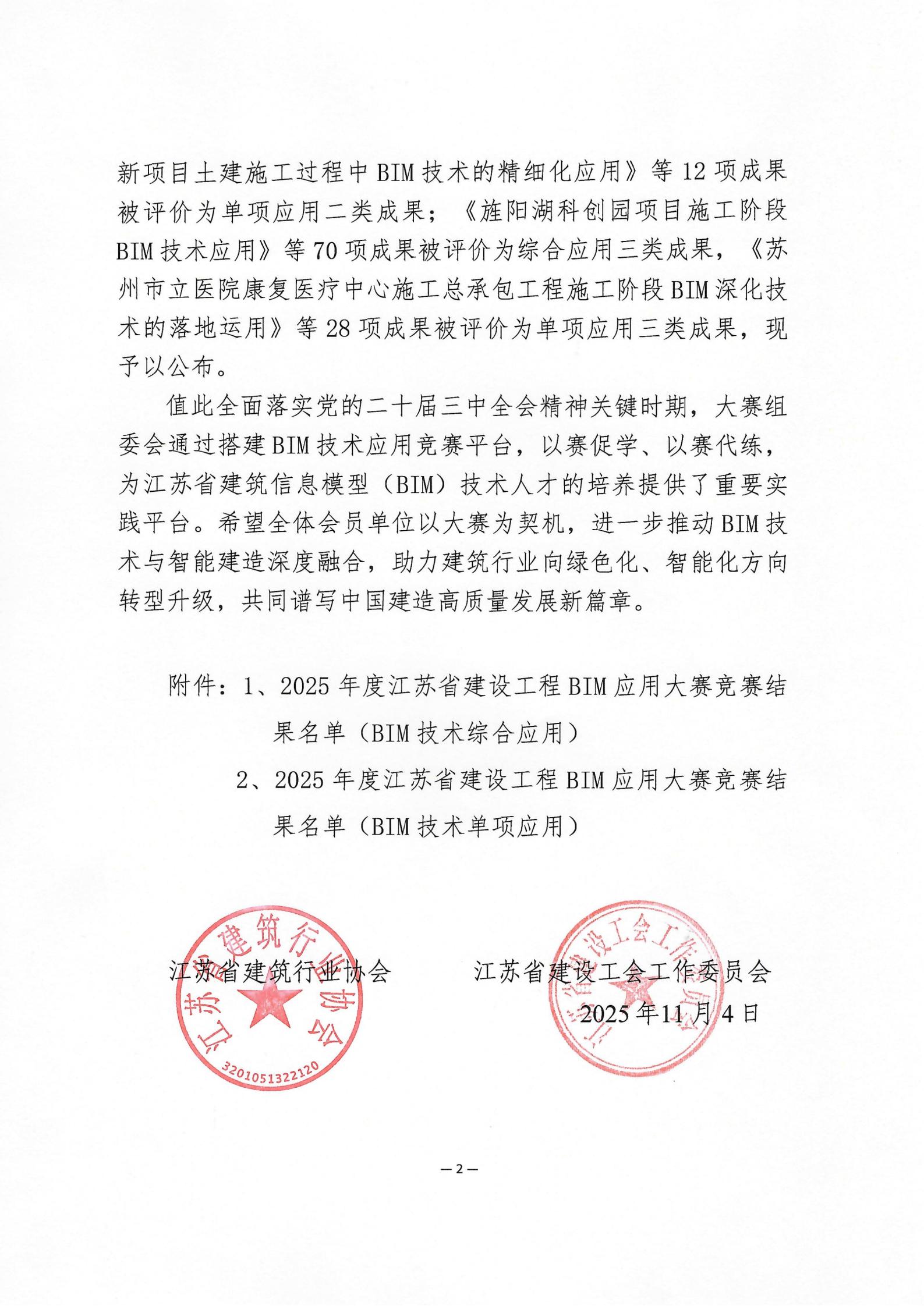 附件:1、2025年度江苏省建设工程BIM应用大赛竞赛结果名单(BIM技术综合应用)