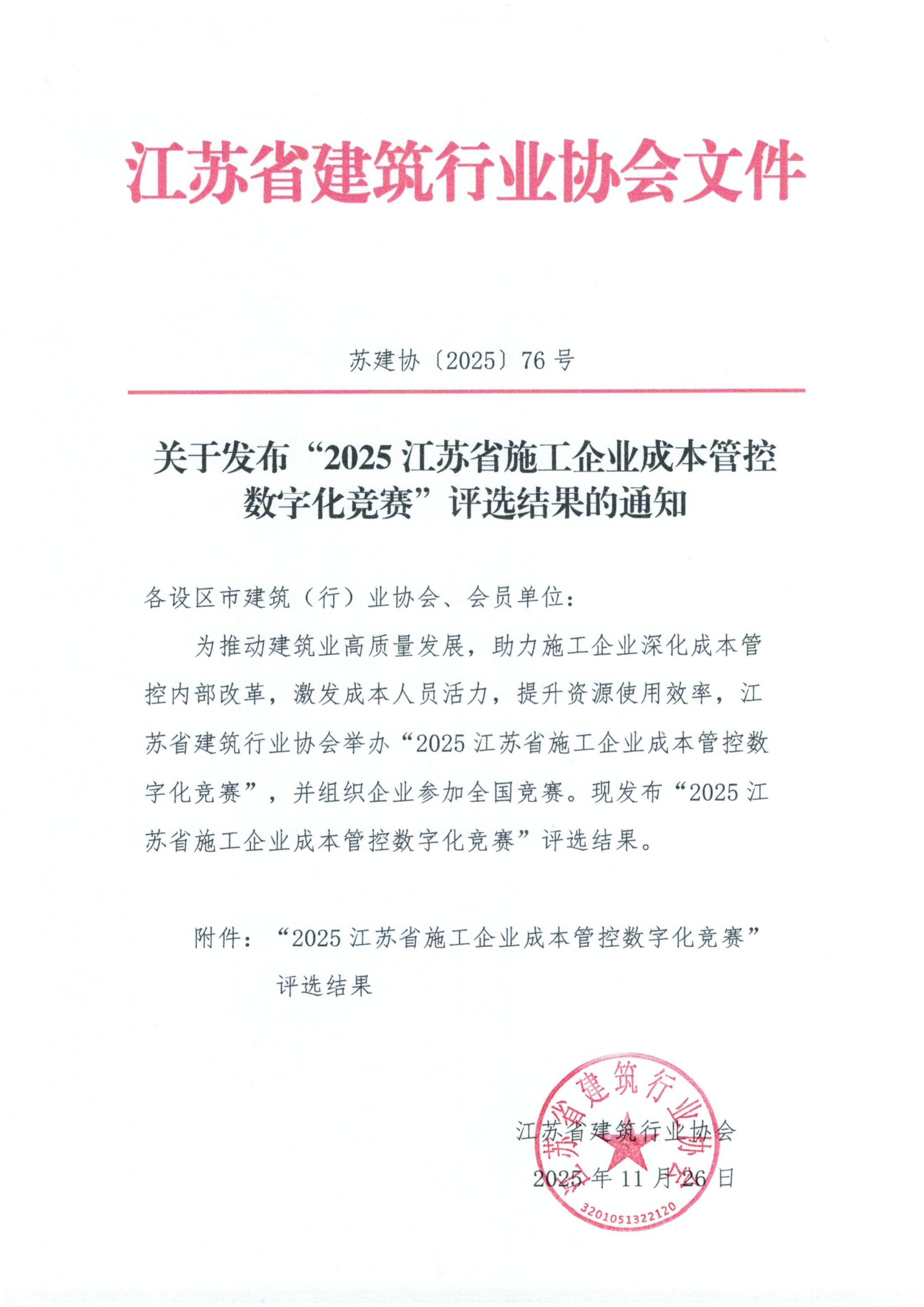 关于“2025江苏省施工企业成本管控数字化竞赛”评选名单的通知